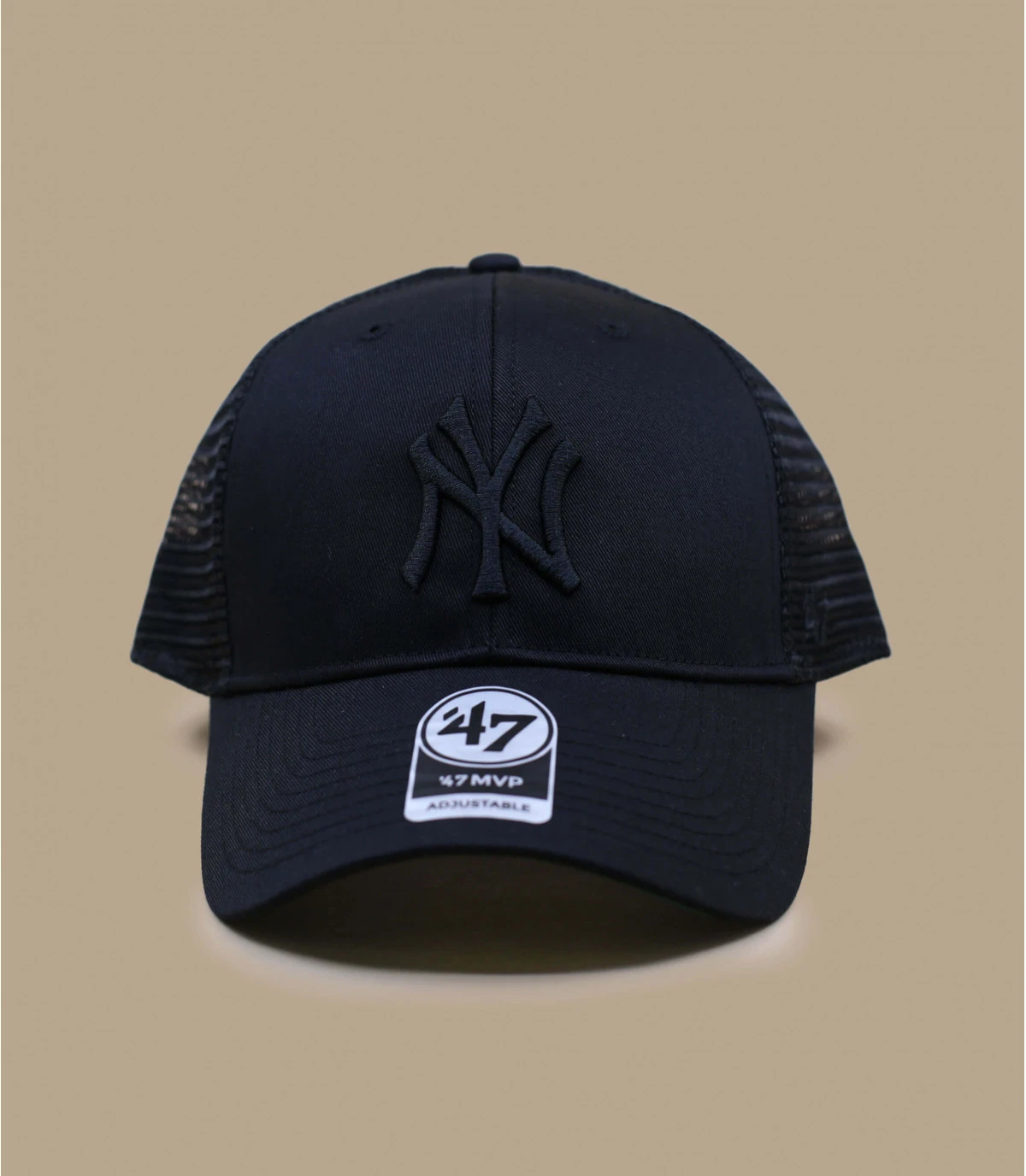 Une casquette NY fraîche et discrète en noir intégral, brodée ton sur ton des initiales de l’équipe de baseball. Ce modèle de trucker sobre nous est proposé par le spécialiste américain du headwear sportif 47′.