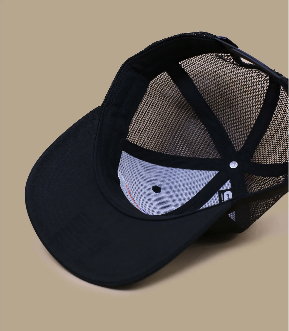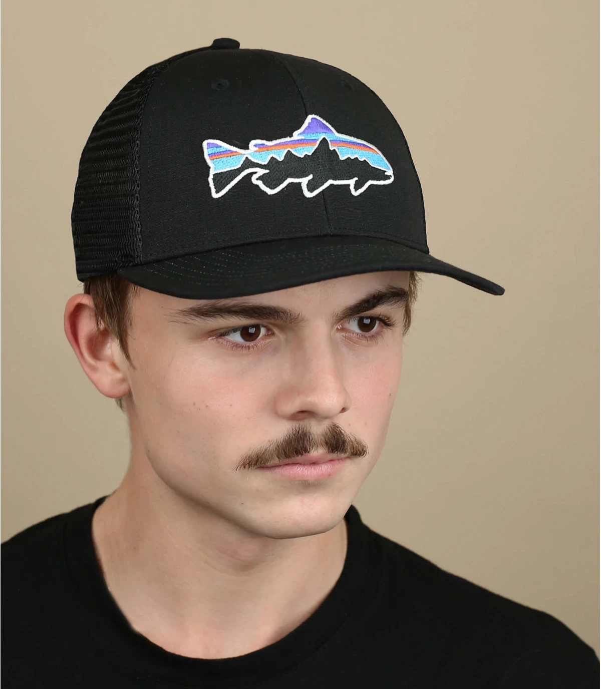 Adoptez cette casquette trucker de coloris noir qui porte un dessin de truite Ă l’avant, dans l’esprit d’un mode de vie outdoor. La visière est Ă©co-responsable et faite en matĂ©riaux recyclables, et l’avant est en coton biologique.
