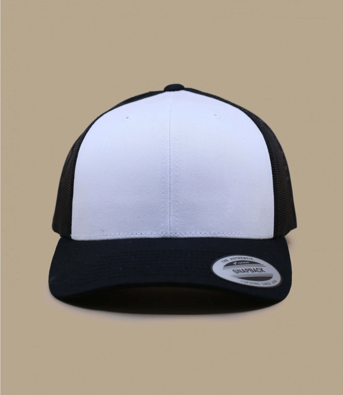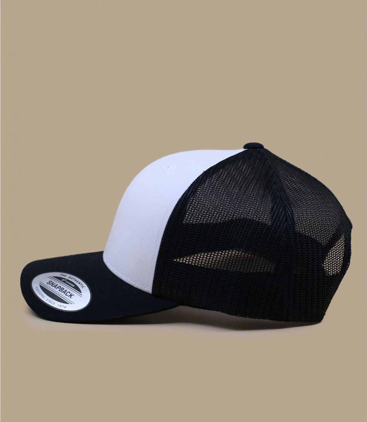 Casquette Trucker blanche avec filet et visière noirs. Languette de rĂ©glage Ă l’arrière, tour de tĂŞte 56-60 cm.