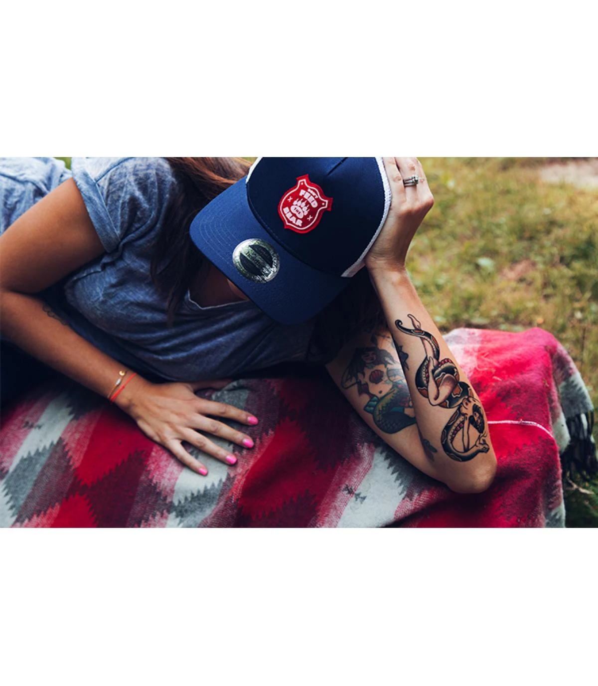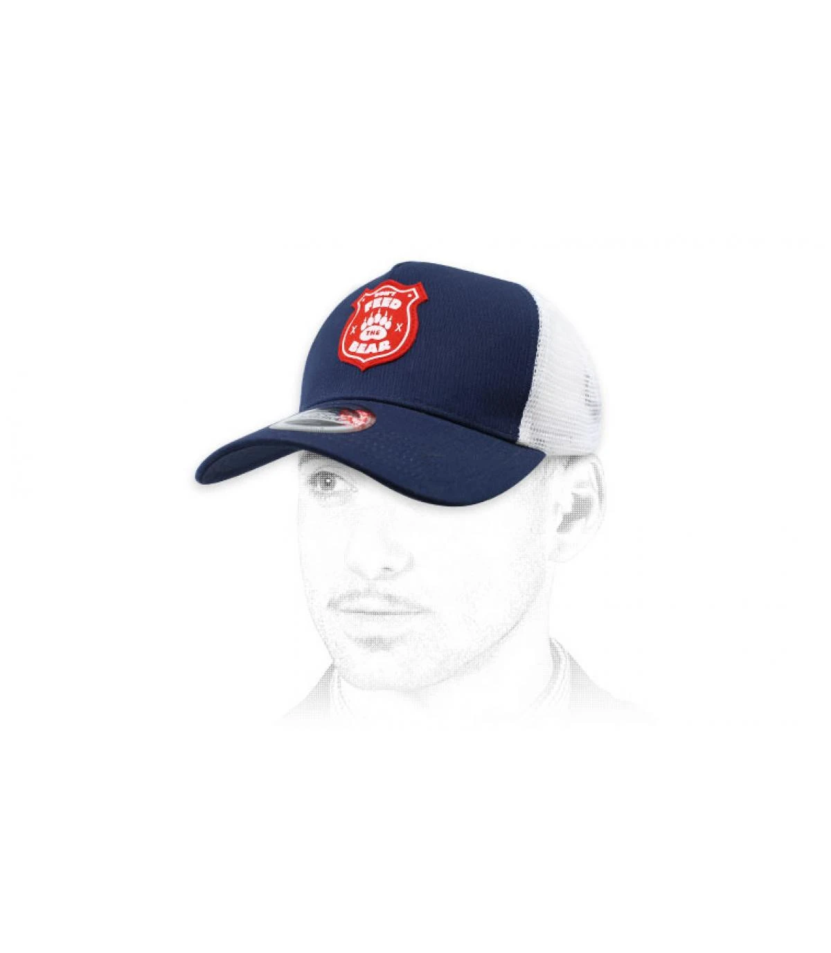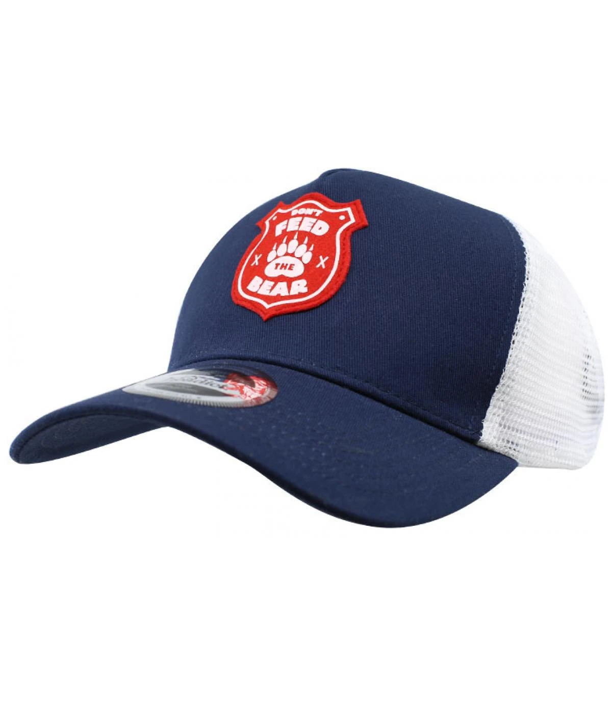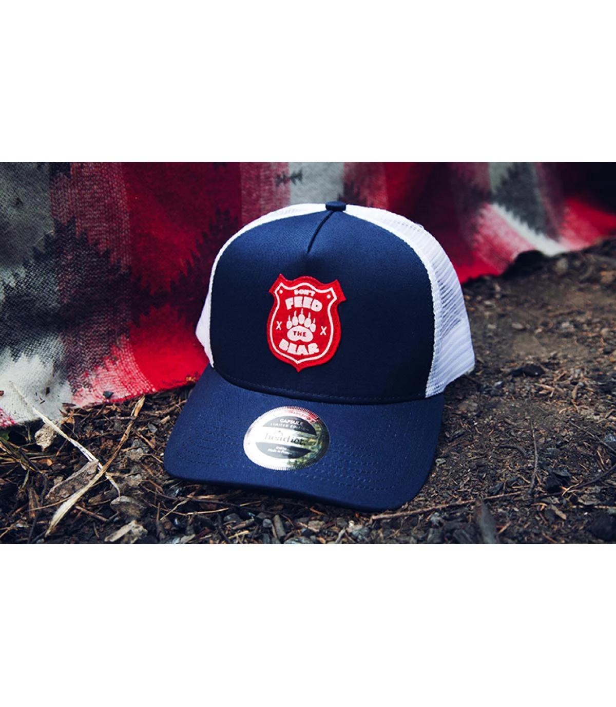 Esprit outdoor rétro pour cette casquette trucker bleu marine, décorée d’un patch rouge et blanc en feutrine imprimée, exclusif pour Headict. C’est la pancarte classique affichée dans les parcs naturels américains, « Don’t feed the bear », ne nourrissez pas l’ours, ou il risque de vous suivre jusque chez vous…