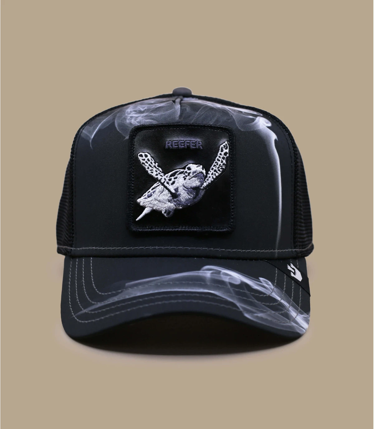 Cette casquette trucker noire est totalement high ! Elle est décorée d’un imprimé sur toute sa surface représentant un trait de fumée. A l’avant est dessinée en noir et blanc une tortue de mer nageant sous l’eau.